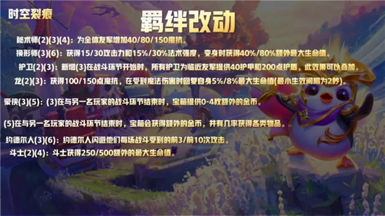 羁绊稍微改动了一点点,斗枪现在只能4斗4枪了,不知道强度如何,但是换成大嘴C的话应该可以,让我期待的就是5豪侠了,新赛季还是可以摇头男枪了,在当初的4枪3剑的78人口补上另外两个豪侠即可,舍弃掉6枪。其他的羁绊改动倒不是很大。