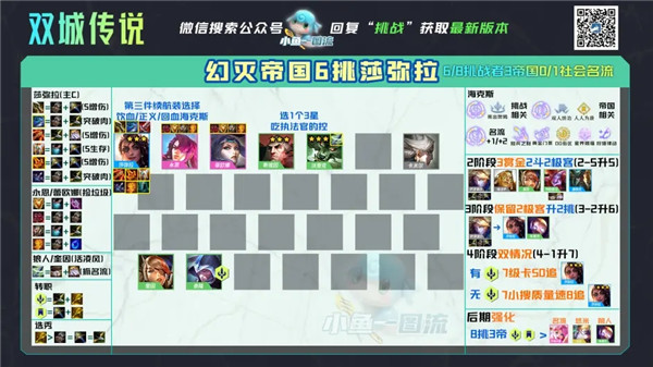 莎弥拉在未成形前站第二排,成型后站第一排,别怕2星塔姆,3星暴力装吃帝国暴君BUFF,任何前排都是瞬间秒杀;