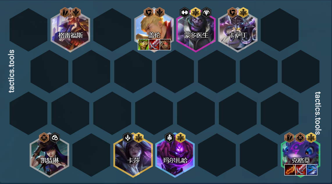 阵容组成:虚空行者(卡萨丁)、德玛西亚之力(盖伦)、凯特琳(女警)、格雷福斯(男枪)、深渊巨口 克格莫、卡莎、蒙多、马尔扎哈(变异战士选择:破蛹之变>虚空降生>旺盛胃口)