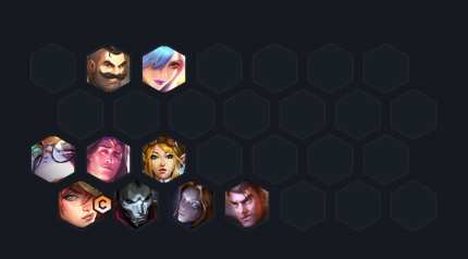 5、站位图:布隆+蕾欧娜位于前排吸收火力,而后两排保护好厄运小姐和其他的后排输出者,杰斯也作为后排远程输出提供火力辅助。