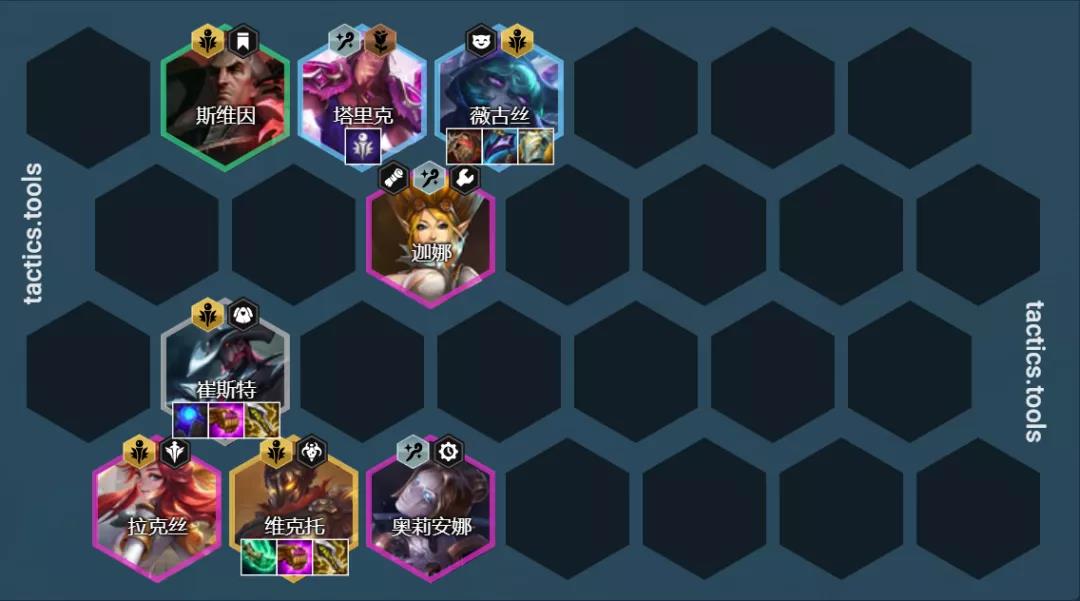 阵容组成:崔斯特、奥利安娜(璐璐3星用璐璐)、斯维因、薇古丝、塔里克、马尔扎哈/拉克丝(吉格斯3星用吉克斯)、迦娜、维克托