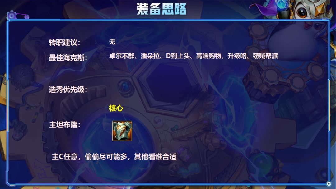 装备最重要的只有前排布隆必须给个石像鬼,其他只要合适即可,适合谁C就给谁,海克斯就是最强的装备。