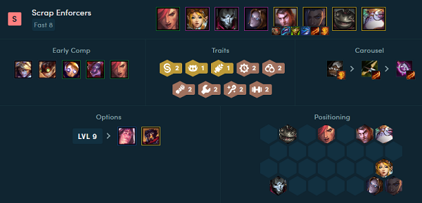 4、装备搭配:【蒙多】小反甲+龙牙+狂徒;【船长】饮血+无尽+飓风。作为前后两个输出点,船长和蒙多是需要给予足够装备的,而姐妹羁绊的蔚和金克丝则是该阵容的添头,金克丝为4枪手提供了一个羁绊。