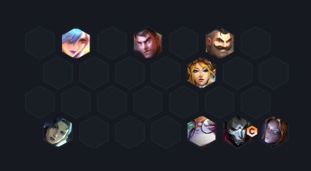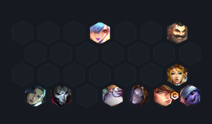 5、站位图:在站位上让蕾欧娜和布隆这两个保镖在前排是很合理的,而风女保护厄运小姐这个主C,另外烬和女警在另一侧输出,让主要的输出核心分散,这样会更稳定,避免一起被集火秒杀。