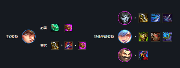 4、装备搭配:【好运姐】青龙刀+法爆;【烬】无尽+巨杀+最后的轻语;【蕾欧娜】狂徒+小反甲。各司其职,好运姐作为魔法师主要依靠技能输出伤害,提供法术暴击能施展更多技能效果,而烬才是阵容的核心,优先给烬足够的攻击装备。