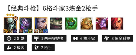 2、羁绊: 2姐妹、1未来守护者、6格斗家、3炼金科技、2极客、2枪手