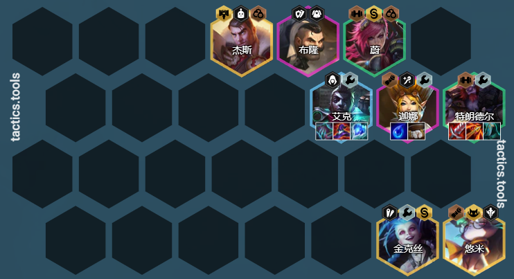 大后期:杰斯换凯特琳,悠米换丽桑卓,之前没有就单挂出2学者打控,金克斯换布里茨,有任意一张牌不来,空位补发条拉人打乱阵型,顺带补白魔法师加全队魔抗,杰斯坦度够了就往前站当肉