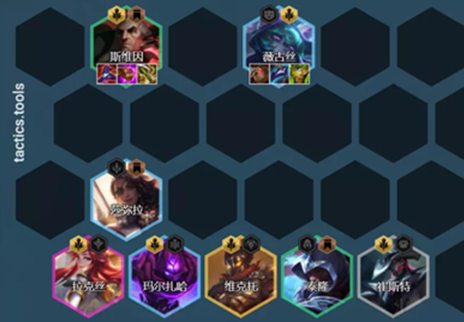 阵容组成:崔斯特、斯维因、泰隆、薇古丝、马尔扎蛤、拉克丝、莎弥拉、维克托