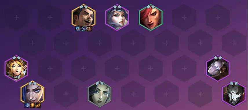 未来守护者 杰斯(5)、无双剑姬 菲奥娜(4)、皮城执法官 蔚(2)、风暴之怒 迦娜(4)、暴走萝莉 金克丝(5)【阵容定核 主C】、皮城女警 凯特琳(1)、戏命师 烬(4)、发条魔灵 奥莉安娜(4)