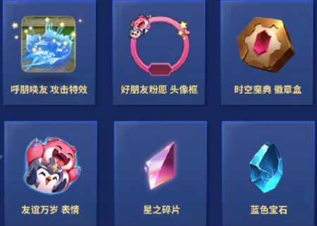 呼朋唤友 攻击特效、好朋友粉愿 头像框、友谊万岁 表情、时空魔典徽章盒、星之碎片等游戏道具;