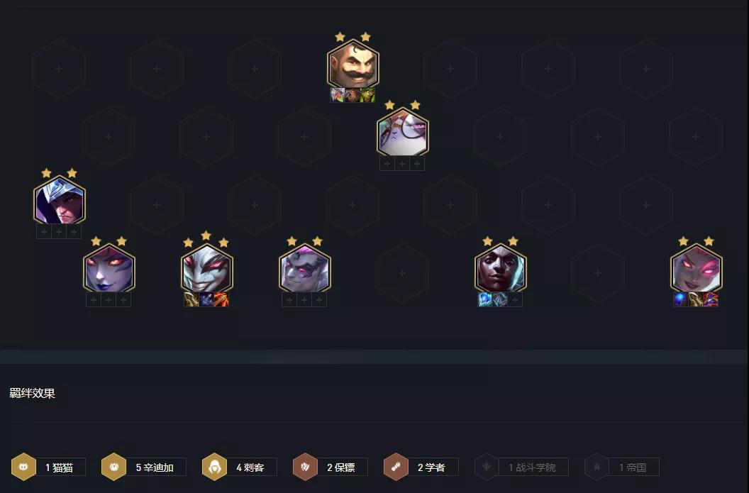 辛迪加在更新中双抗获得大增强,辛迪加刺客因此崛起,且强度大幅度攀升,今天对局测试中吃分与吃鸡强度非常高。过渡较为平滑,前中期卡特携带阿卡丽装的装备,稳血强度较高,只要不被针对或同行过多都能找到阿卡丽。这套阵容不是赌狗阵容,主C不是小丑,大家一定要注意。
