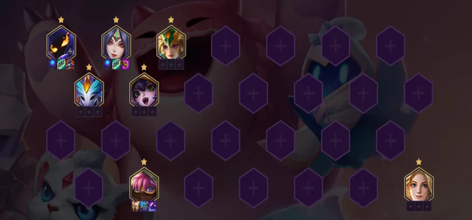 3-2回合拉6人口开始D卡,仙灵女巫 青丘灵狐 小法师 天雷引 激流之鳞 光元素使,手速一定要快,我们D到剩下20金币,搜到上面的这些卡,把前面的那些打工仔都卖掉,装备给主C和副C站位图在下面。