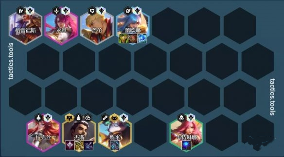 阵容组成:盖伦、男枪、卡特、蕾欧娜、拉克丝、永恩、悠米、杰斯