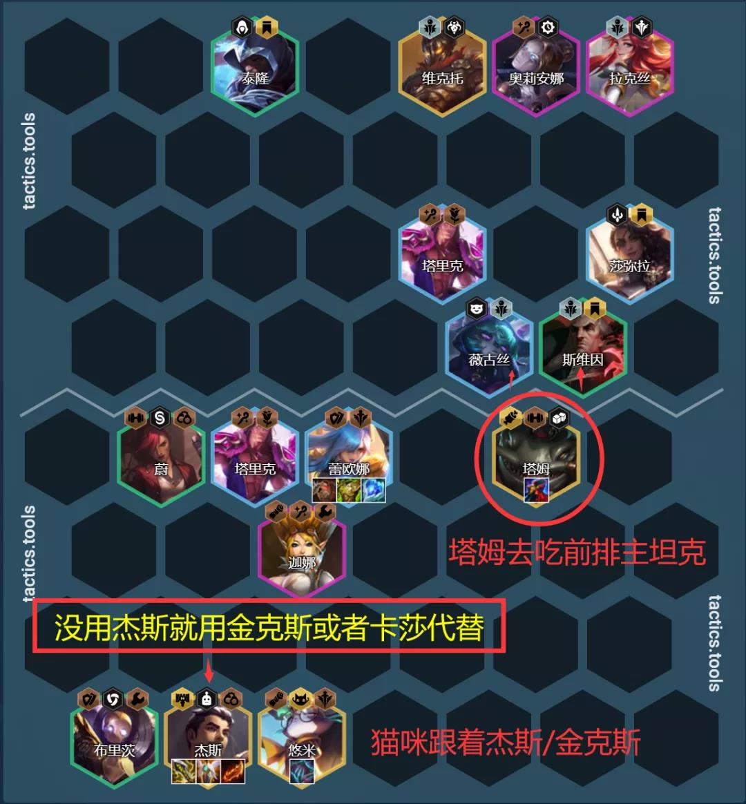 阵容成型后期主要是以5费卡为主,但是5费卡并不是这套阵容的刚需。和名流卡莎不同的是,阵容非常吃卡莎这张卡牌,通常没有2星就非常难有分。而这套阵容如果没有塔姆和猫咪,可以用丽桑卓和巨魔代替,没有杰斯、金克斯,也可以用卡莎代替,这三者都没有我们还可用剑姬来代替。阵容灵活多变,才是上分的最佳选择。