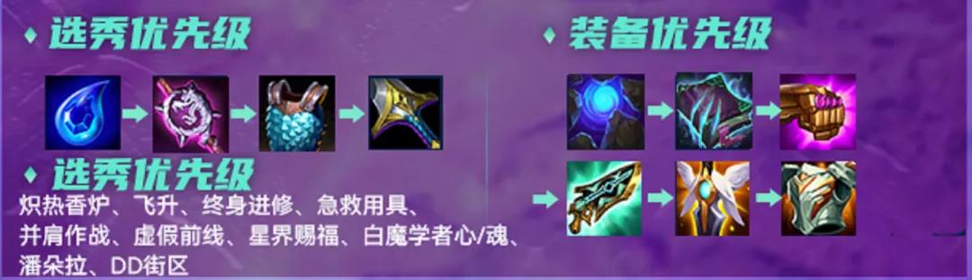 飞升在15秒后极大加强大头输出,基本一个技能就能秒掉敌方非前排棋子,炽热香炉能增加大部分棋子攻速,特别是大头增加2次攻速后,技能释放频率极快,基本2秒一次技能,终身进修则是增加法强增叠加输出能力,急救用具则是全员适配,极大增加阵容的续航能力。