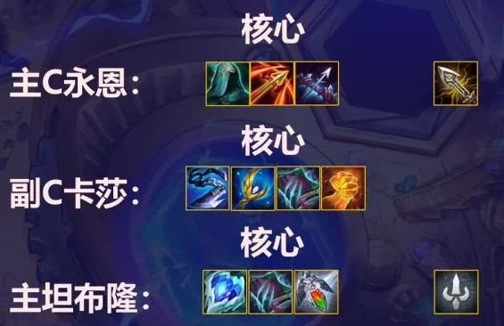 冰心鬼书为核心,冰心打前排C位阵容或者刺客等突进阵容均有奇效,延缓对面启动速度。鬼书打出减疗效果。最后一件可做救赎,反甲,狂徒,龙牙等等。有挑战转优先给布隆挑战转,挑战布隆,谁用谁知道!