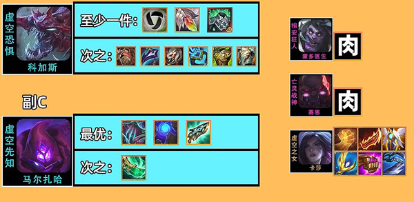 4、副c我们不养卡莎,我们养马尔扎哈,我们给蓝buff,鬼书,还有科技枪三个装备;