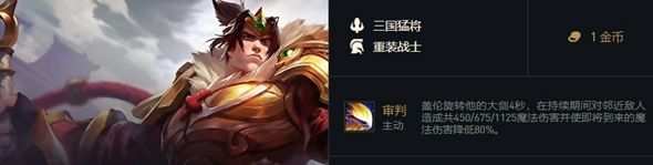 [三国猛将]们拥有额外的生命值和法术强度。他们在登场后每打赢场战斗,就会使这个额外加成提升10%,至多可叠加5次。