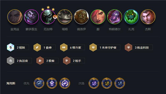 1、阵容搭配:蒙多+厄加特+金克丝+蔚+扎克+杰斯+俄洛伊+巨魔+塔姆