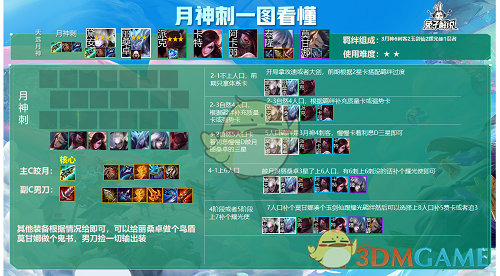 2、这套阵容只建议开局天选月神皎月或者天选月神冰女,其余天选一律不要,这套天选要求比较苛刻,所以没有天选开局不建议大家走这套阵容赌狗月神刺这套阵容非常简单,就是赌出4星皎月即可,然后再给皎月搭配下4刺客羁绊,如果有刺转情况下让冰女刺转,再补充一个刺客即可。
