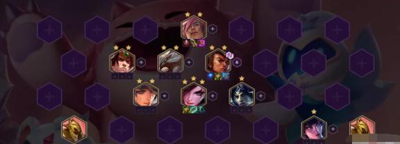 5-1回合,8人口,奈德丽、盖伦、嘉文四世、蔚、卡特琳娜、赵信、阿兹尔、瑟提,卡特琳娜追三星,所有C位给好装备,阿兹尔的两个沙兵放在最右下角,对面盲僧就不会把我们的英雄踢出去。