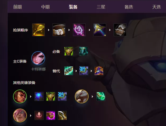 卡特琳娜是阵容主C,这三件装备是公认的三件神装了,我个人有时候没有科技枪用离子火花代替发现效果显著,大家可以尝试一下。