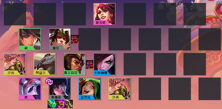 阿兹尔和嘉文四世站队伍中间为队友提供护盾。两个沙兵用来保护后排。