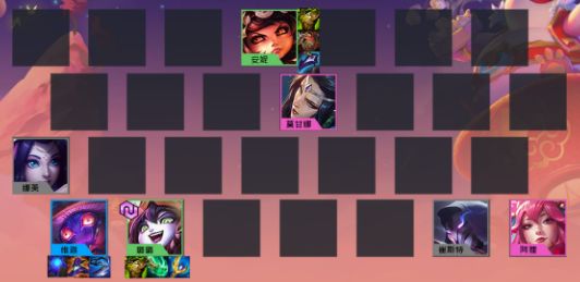 小法底角站位,然后用娜美和露露围住小法防止被刺客切。卡牌和狐狸站在另一个底角,起到分散火力的作用,安妮站在最前排,双重施法的安妮穿上肉装那是非常能抗的,完全不虚被集火,而且露露会在后面给安妮提供额外血量。莫甘娜的站位可以随意。
