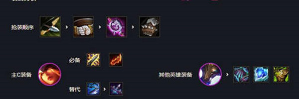 3、装备的话很简单,主c是希维尔,必备电刀羊刀这两个是必备的,如果你想更花一点可以在装备一个电刀,双电刀一个羊刀,如果你想保守一点打出伤害的话就用巨杀或者轻语,主坦克牛头,鬼书,冰心,狂徒即可,同时抢装备优先反曲弓;