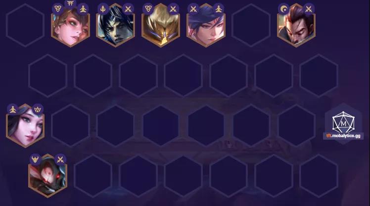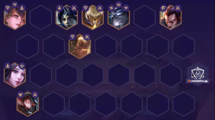 后续到了五阶段直接升上八人口,搜出慎补充宗师羁绊,下剑姬补一张盲僧,慢慢提升阵容整体质量即可。注意滑板鞋的站位不要被刺客抓,如果亚索有三星,则也可考虑搜出一张永恩替换风女。