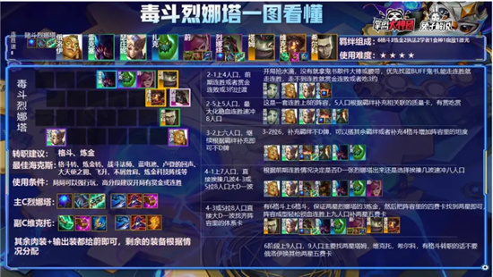 阵容整体节奏其实很简单,女枪、老鼠、火男、蚂蚱几种适合吃蓝BUFF的卡打工,连胜或者赏金速冲8人口找到两星烈娜塔,前排能抗就能锁,烈娜塔最后一波加强伤害过高,但是死了伤害消失!阵容核心就在于三神装烈娜塔的强度,现在来说绝对是超模的,即使你不搭6斗,在任意前排够肉的体系中单挂一个神装烈娜塔都可以随便吃分,但最契合的还是格斗,一是因为6斗好凑并且扎克可以跟烈娜塔搭3炼金、烈娜塔也能享受格斗血量加成,二是因为塔姆能提升阵容上限!有条件可以多做几个虫子拖时间嘲讽敌人叠加毒雾的伤害!