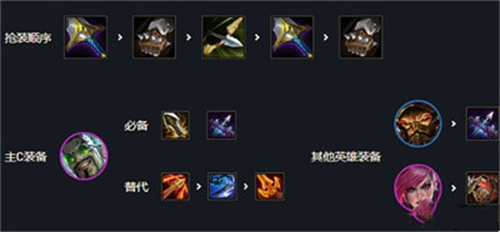 无尽和轻语是必备装,德菜文的攻击是从前排开始的,需要有足够强的切肉能力。第三件选择空间更大,容错可以选水银或者正义,要伤害可以选巨杀、飓风、杀人剑等等。主T选蔚主要是发挥蔚的技能破甲,让德莱文切肉更快。副C选蛮王,做任意AD装备即可。