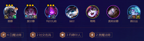 2、阵容羁绊:4白魔法师2社交名流3约德尔人2黑魔法师