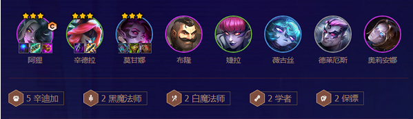 2、阵容羁绊:5辛迪加2黑魔法师2白魔法师2学者2保镖