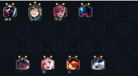后续到了决赛圈升九,直接单挂五费牌,杰斯为后期主T,希尔科、塔姆都可以,注意站位让艾瑞莉娅尽量不要对位到对面最肉的前排,刀妹需要迅速解决掉第一个目标刷新技能收割。如果有强袭转给赛娜补皇子开6强袭,看情况也可以开4执法,补足阵容成型后基本无敌。