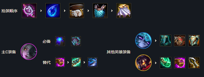 开局优先抢大棒,其次水滴,狐狸的鬼书和蓝BUFF是关键的两件套。第三件法爆、科技枪、帽子都可以。前期最好是三约德尔过度,火男拿装备打工,三阶段再换成蚂蚱