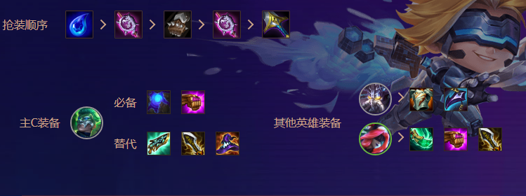 主C布兰德蓝buff必备,因为火男的蓝条只有20点,带上蓝Buff后可以实现无限开大,带有爆炸伤害的同时,每两发大招还能触发一次眩晕,因此控制也是非常足。火男在配备蓝Buff加一件输出装后,就可以优先找好前排卡萨丁的装备了,只要前排肉得住,火男就能无限输出,轻松清场。