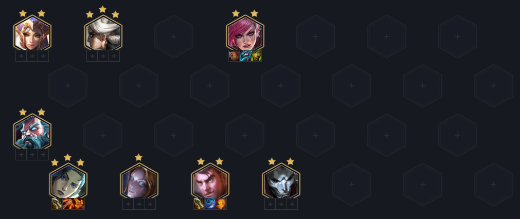 阵容组成:瑟庄妮(2)、卡蜜尔(1)、蔚(4)、基兰(2)、凯特琳(1)、奥莉安娜(4)、杰斯(5)、烬(4)