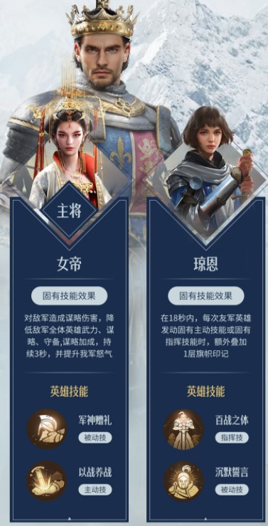 评价:全队辅助女帝,依赖主将技进行输出,多队野战可以一次性消灭大量部队。因为组队战斗中不会释放主将级,不适合参与组队战斗。
