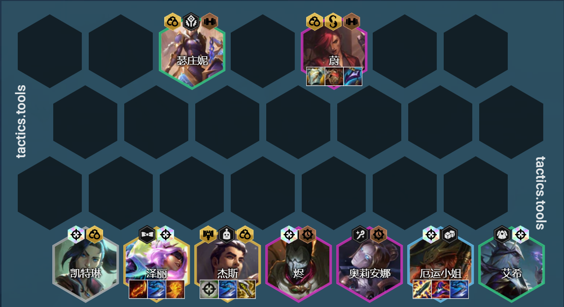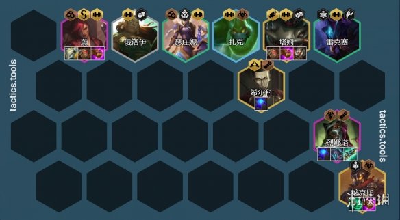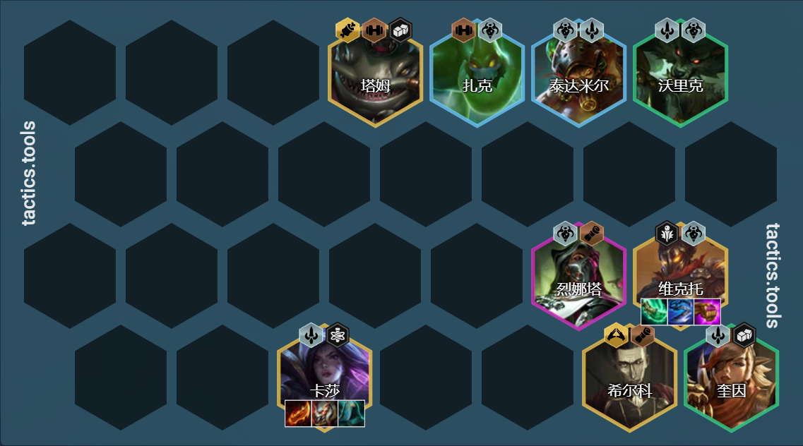 中期补充6黑魔羁绊能够增加阵容整体的伤害,后期只要有2星金克斯和维克托就可以收菜,而且如果有8黑魔羁绊的情况下,维克托和金克斯的伤害非常爆炸,因此这是一套非常强力的过渡阵容。