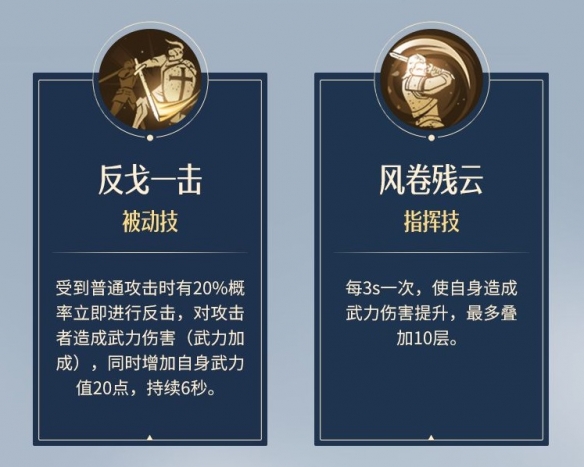 被动:受到普通攻击时有20%概率立即进行反击,对攻击者造成武力伤害(武力加成),同时增加自身武力值20点,持续6秒。