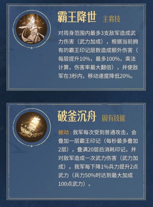 被动:我军每次受到普通攻击,会叠加一层霸王印记(每秒最多叠加2层),叠满20层后消耗印记,并对敌军造成一次武力伤害(武力加成)。我军每下降1%兵力提升2点武力(兵力50%时达到最大加成100点武力)。