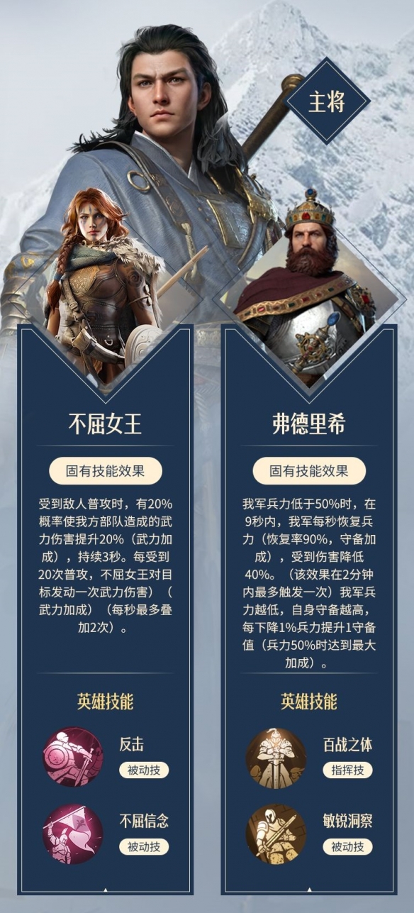 依靠带有反击效果的技能输出,50%兵力时触发项楚和弗德里希的固有技能效果,在战斗中段锁定胜局。