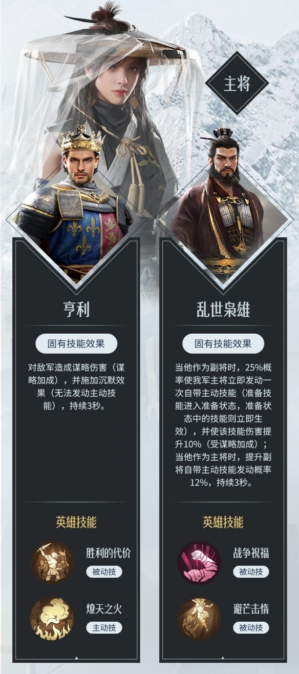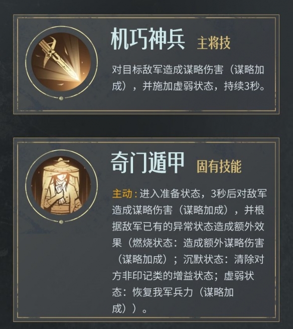 被动:自身固有主动技能和固有追击技能的发动概率提升,造成谋略伤害提升。