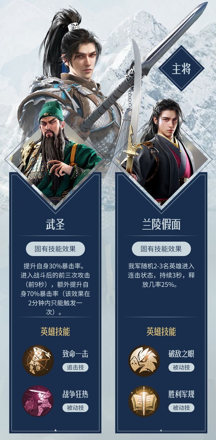 依靠追击技能进行输出,核心辅助兰陵假面依靠主将技提升全队追击技能触发概率。