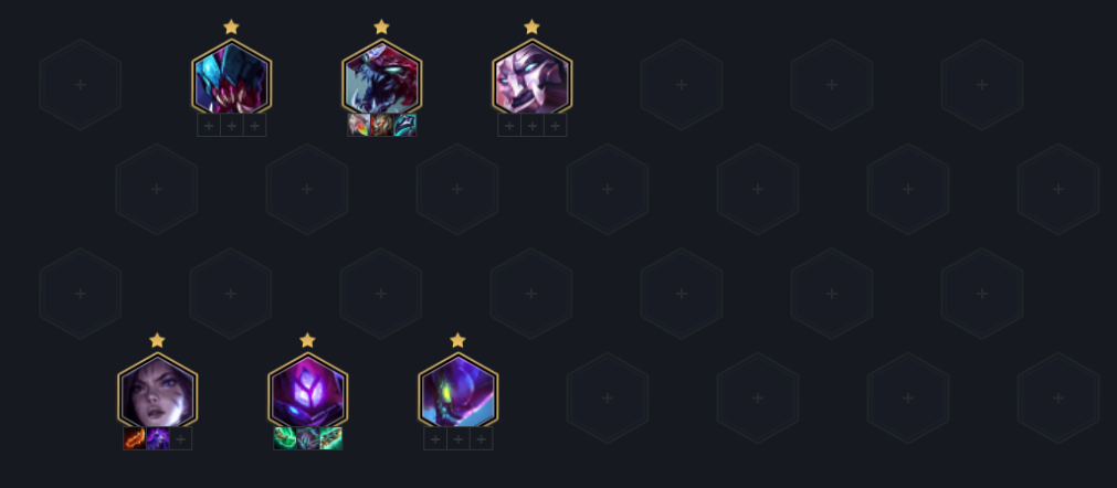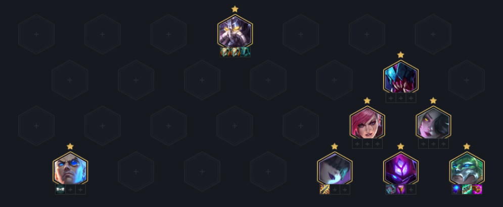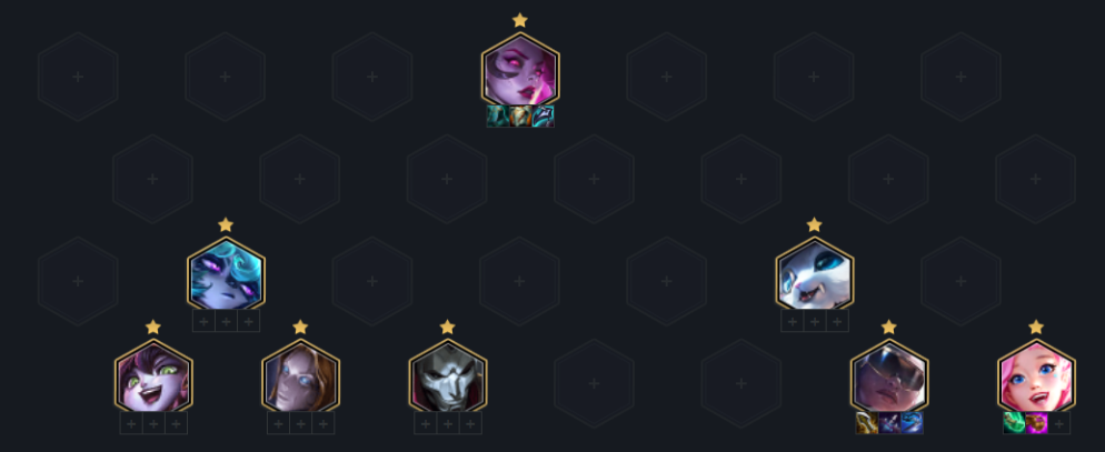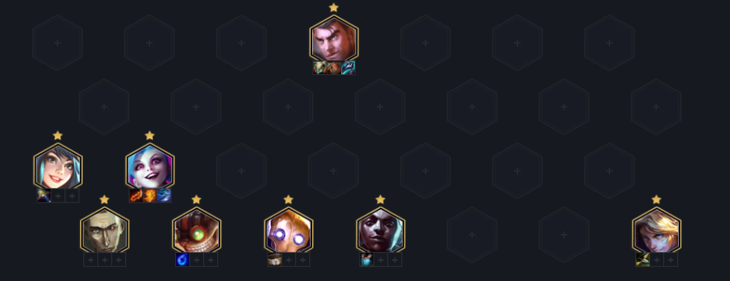 阵容核心思路就是连胜速冲7人口,D三星赛娜然后上人口, 前期三约混经济,中期用黑白魔,或黑魔枪过度即可。