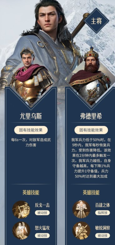 依靠带有反击效果的技能输出,50%兵力时触发项楚和弗德里希的固有技能效果,在战斗中段锁定胜局