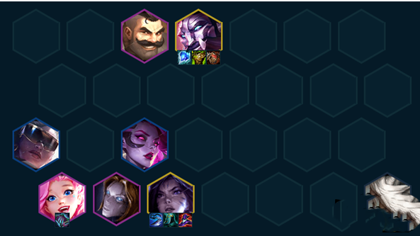 顺利就5-2上九,搜出二星卡莎、二星加里奥和二星布隆,注意节奏没容错就每回合都梭哈,可以拿泽丽、塔姆、杰斯、维克托等五费先顶着再找卡莎。不顺利的话4-7拉八大搜找出一个吃名流位的四费卡,可以是蔚、螳螂、德莱文或者刀妹,优先保分。