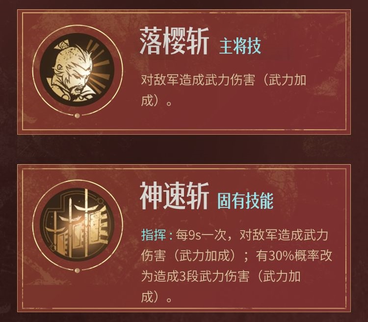 指挥:每9s一次,对敌军造成武力伤害(武力加成) ;有30%概率改为造成3段武力伤害(武力加成)