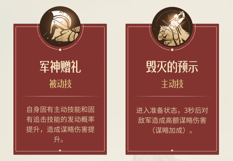 被动:自身固有主动技能和固有追击技能的发动概率提升,造成谋略伤害提升。